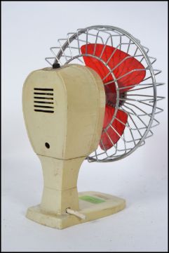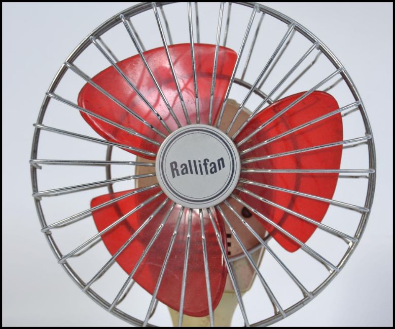 A vintage retro Rallifan miniature desktop electric fan. With original red blades. Measures H25 x W18 x D16 (cm).