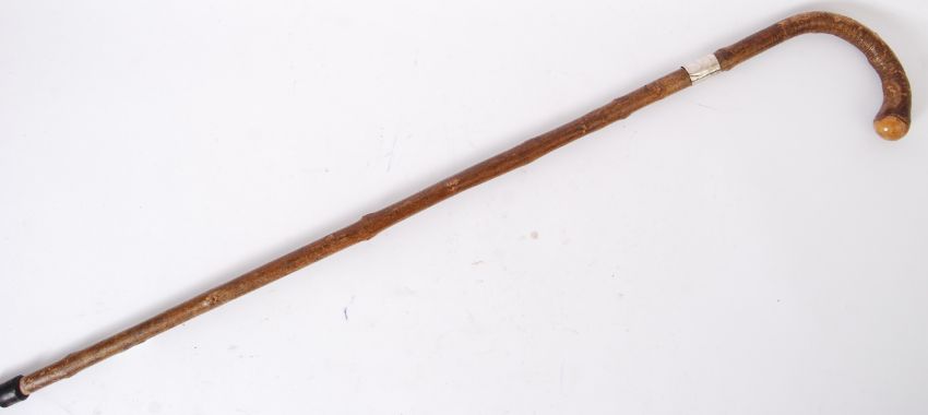 CANE: A First World War WWI interest hallmarked silver collared walking stick cane, the band engraved ' 1914 - 1919 '.