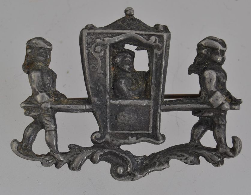 A 1920s pewter metal brooch in the form of two footmen carrying a carriage with c clasp. Measures 4.5cms
