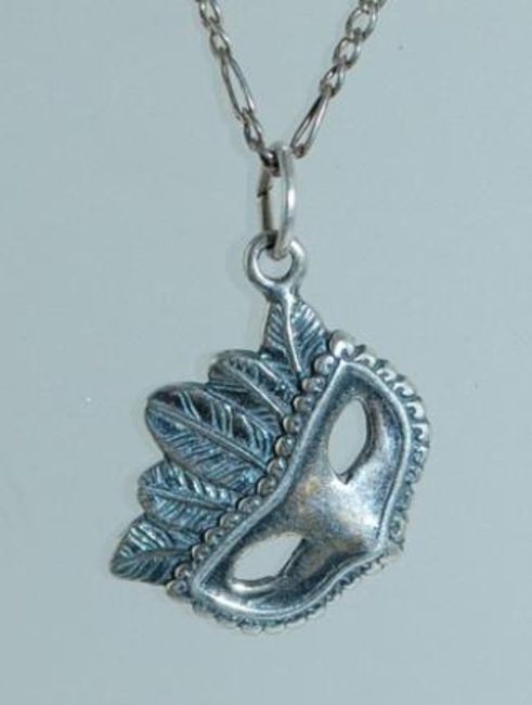 A 925 silver pendant necklace strung with a Venetian mask pendant on a fine Figaro silver chain. Marked 925 to chain and pendant. Measures 18 inches. Weight 3.6g