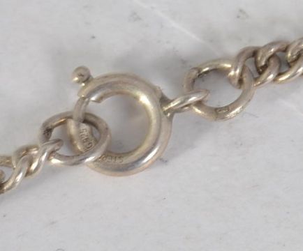 A silver necklace chain with spring hoop clasp. Marked Sterling 925. Measures 18 inches.