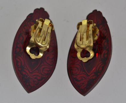 A vintage pair of lucite opaque faceted ruby red earrings. Measures 4.5cms.