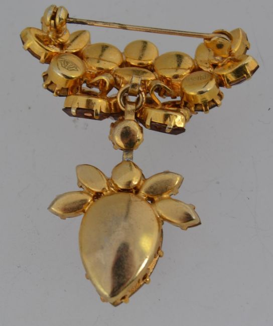 A vintage signed yellow metal Austrian crystal drop brooch with roller clasp. Marked for Schoffel & Co with the crown and Austria marked verso. Measures 5cms.