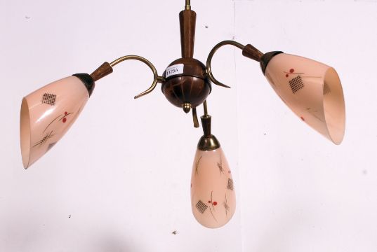 A vintage 1950's 3 branch oak and glass cylindrical ceiling light fitting chandelier. The shades of glass form in peach colour. Measures: 60cm x 60cm x 60cm.