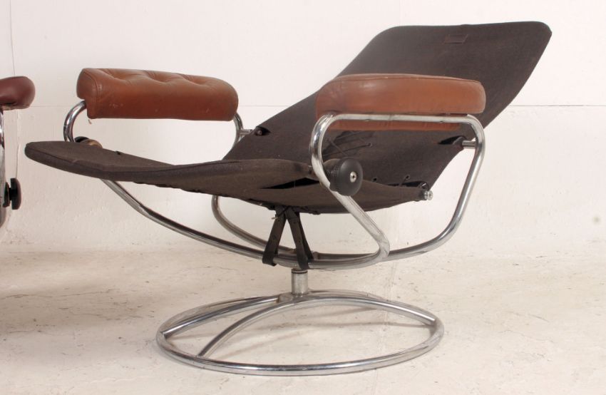 A pair of retro swivel armchairs in the manner of Ekornes dating to the 1970's having leather elbow rests and chrome base. Measures:25cm x 125cm x 30cm.