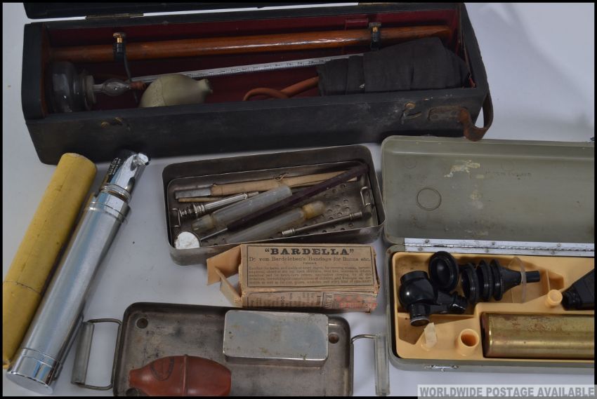 A collection of doctors / medical related items to include blood pressure test, silkworm guts vial, other tools etc