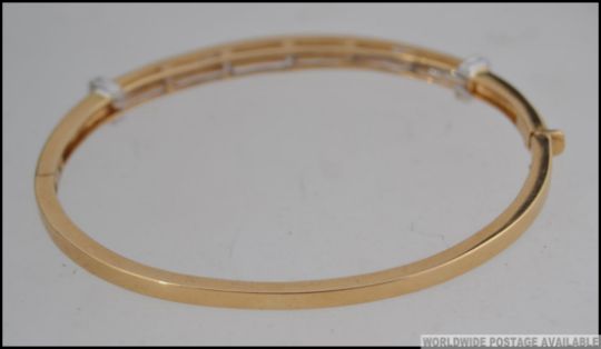 A hallmarked 18ct gold and diamond bracelet bangle with approx 150pts of cushion cut diamonds in a channel setting with hidden clip clasp and safety catch in a presentation box. Hallmarked for London . Weight 15g.