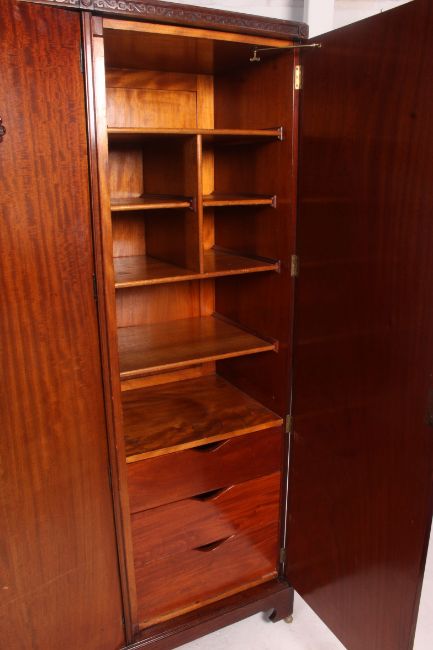 A good quality Edwardian Queen Anne revival mahogany triple wardrobe compactum. Raised on bracket leg plinth base with twin sectional hanging robe flanked by a sentry robe fitted chest of drawers with linen slides above. Dismantles for ease of transport. Matching dressing table in lot 1468. Measures: 203cm x 180cm x 55cm.