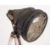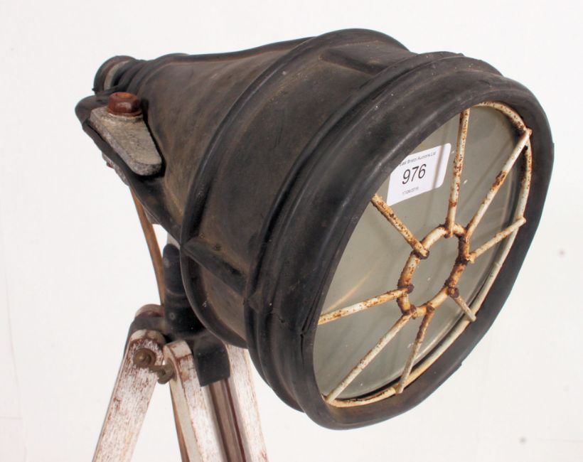 A vintage 20th century theatre / cinema external spot lamp raised on a painted shabby chic wooden tripod. Measures: 145cm x 50cm x 50cm.