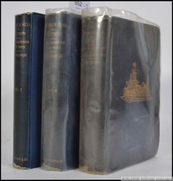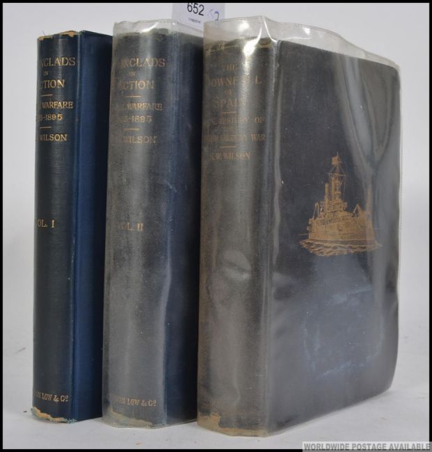 IRONCLADS IN ACTION. A SKETCH OF NAVAL WARFARE FROM 1855 TO 1895 WITH SOME ACCOUNT OF THE DEVELOPMENT OF THE BATTLESHIP IN ENGLAND; Wilson, H. W.1898 Reprint. London, Sampson Low, Marston and Company Limited, 1898. Two Volumes. Both with blue boards, and gilt decoration. ALONG WITH: The Downfall Of Spain, similar book. First Edition c1900.Same Author.