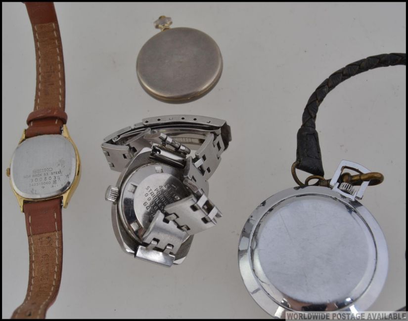 A Smiths 21 Jewels open faced fob watch together with a Citizen Cosmostarv2, Seiko quartz and a carvel white metal fob watch