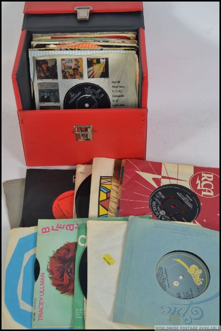 A collection f vinyl 45rpm record singles dating from the 1960's through to the 1990's, allyl in a record carry case