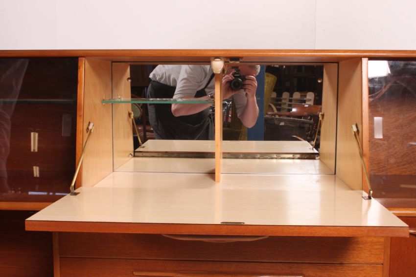 A 1970's G-Plan teak wood sideboard raised on turned legs with wide and upright body having cupboards, drawers and glass cabinets. Measures: 104cm x 166cm x 43cm.