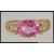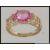 A hallmarked 9ct gold dress ring with large oval cut pink stone in a prong setting with with filigree shoulders set with 6 diamond accent stones. Size N. Weight 2.9g.