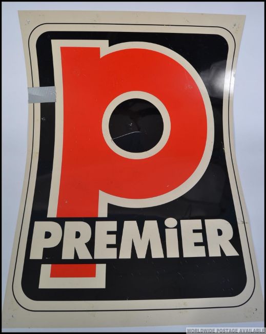 A large 1960's double sided shop advertising display sign for Premier Drums, approx 83cm x 59cm