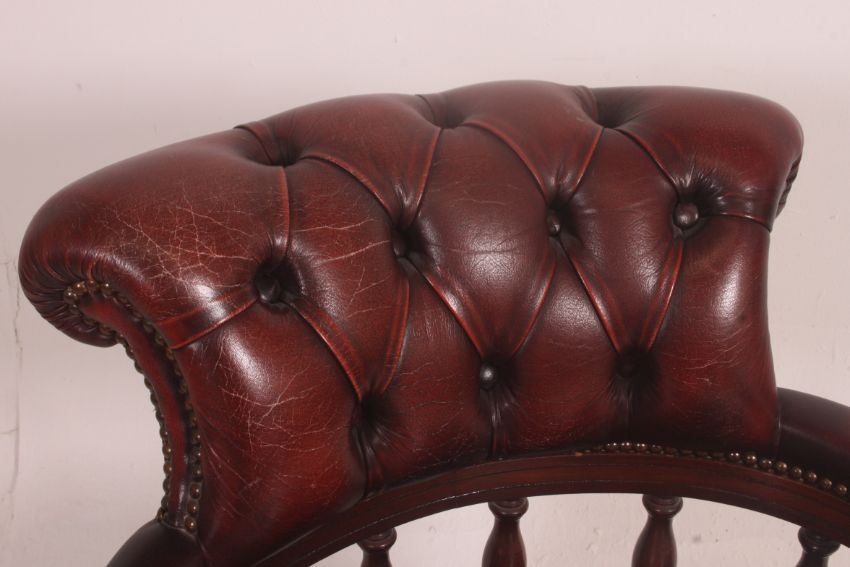 An antique style mahogany and leather captains swivel desk office chair. Raised on splayed reeded legs base with oxblood leather seat and back rest with spindle gallery supports. Measures: 82cm x 62cm x 65cm.