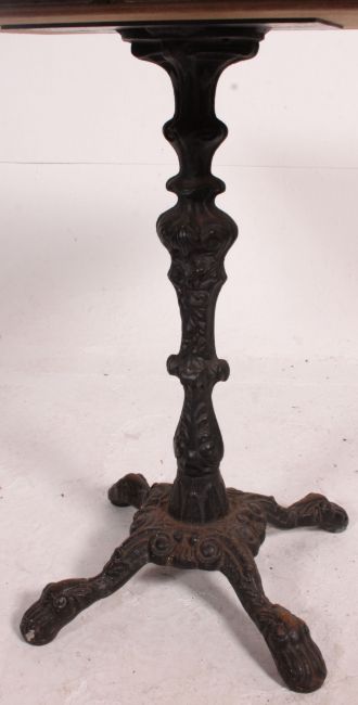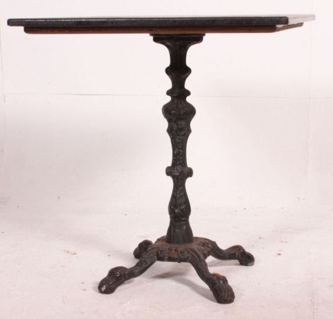 A pair ( one showing) of Granite and cast iron cafe / pub garden tales. The granite table tops of square form raised on cast iron rococo bases. Measures: 73cm x 67cm x 67cm.