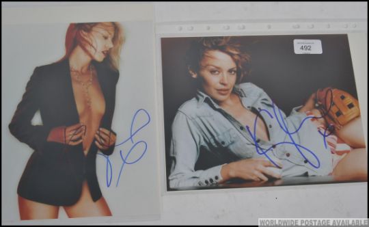 KYLIE MINOGUE; Two 8x10" colour photographs, signed in blue marker by Kylie across a light portion of the images. Come with certificates from a UACC registered dealer.