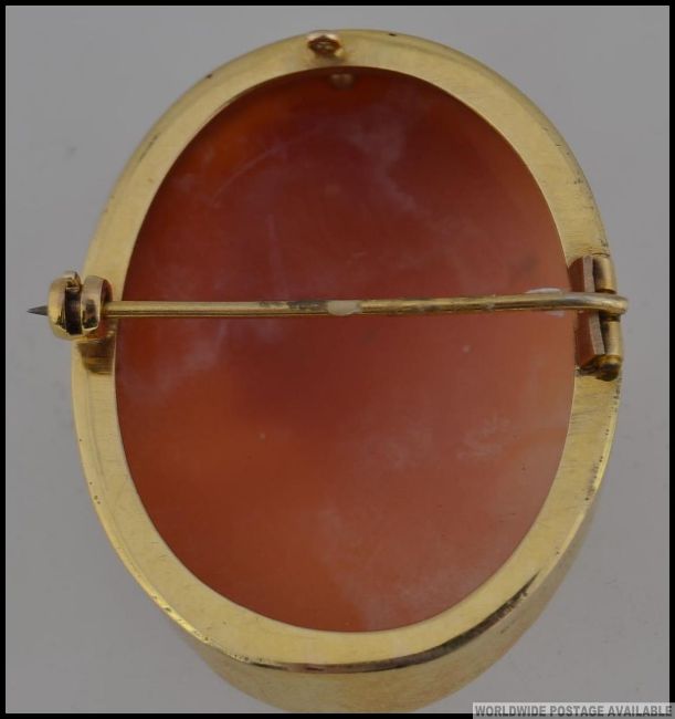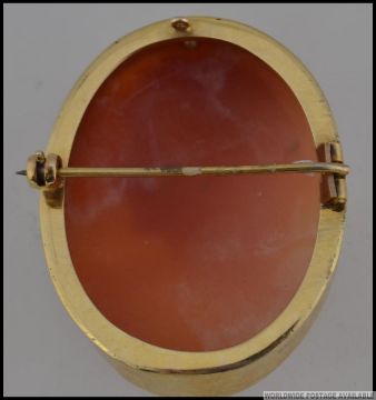 A hallmarked 9ct gold cameo brooch. Hallmarked for Birmingham with roller clasp. Measures 4cms. Weight 11.3g