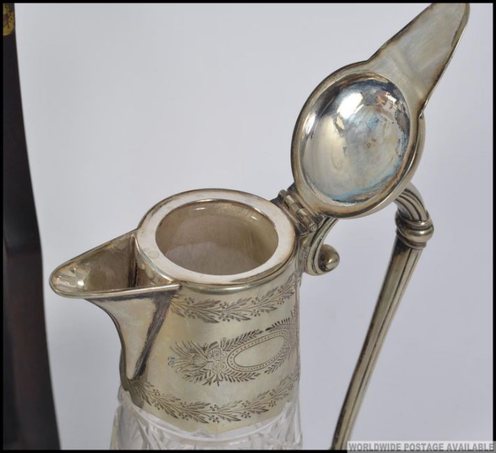 A contemporary tantalus in mahogany case with 2 decanters. Together with a silver plate claret jug. Measures: 30cm H.