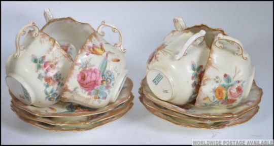 A 19th century Victorian China tea service with applied floral and gilt decoration, consisting of six trio's, and RD 15053 to the base