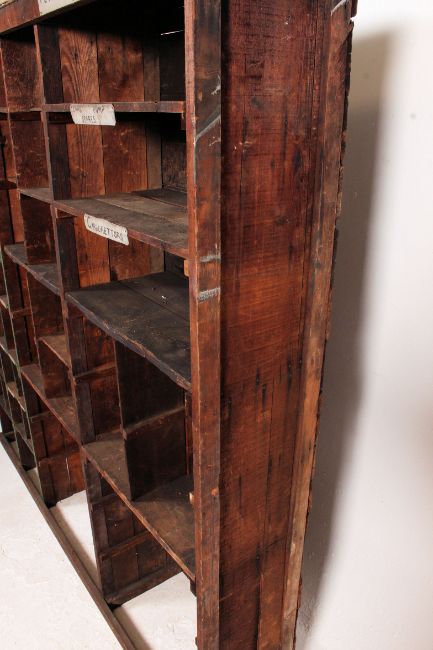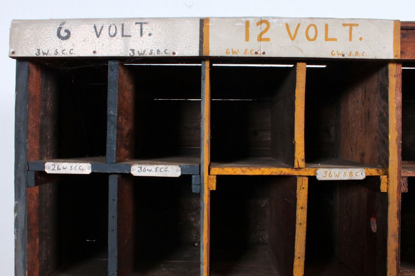A 20th century vintage purpose built garage sectional pigeon hole / parts storage shelving system, various sized holes retaining many original name plaques. Measures: 185cm x 180cm x 35cm.