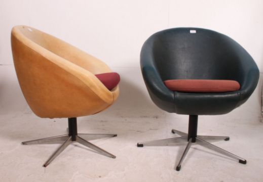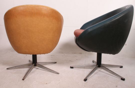 A retro 1970's pair of swivel egg chairs having the original vinyl upholstery and raised on chrome 5 spoke bases. Matching further pair in lot 1175a. Measures: 75cm x 66cm x 60cm.