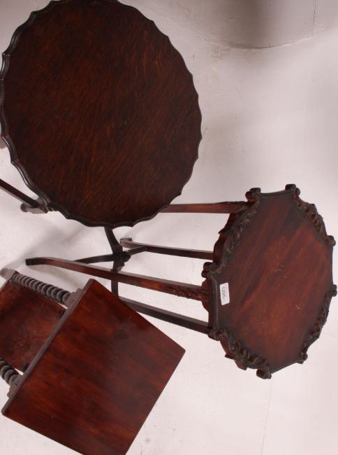 3 20th century plant stands to include a mahogany tall torchere and 2 oak barleytwist plant / side tables. Measures: 99cm x 39cm x 39cm.