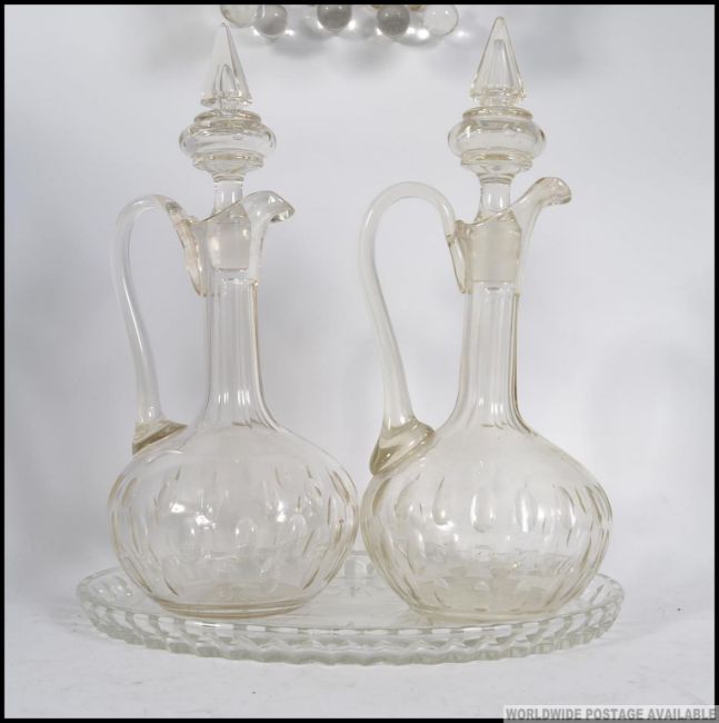 A matching pair of cut glass early 20th century claret jugs, with glass stoppers along with a cut glass trays. Measures: 35cm H.
