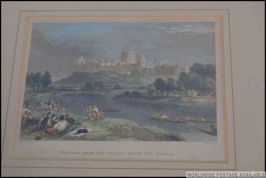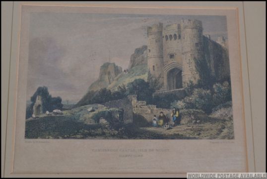 Four framed and glazed hand coloured Lithograph's titled Devon From Shakspeares Cliff, Windsor, Bridport Carisbrike Castle. Measures: 14cm x 20cm.