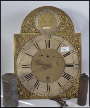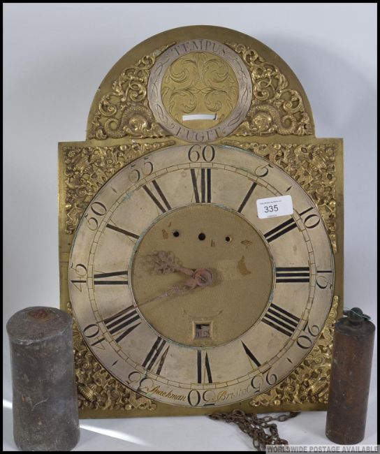A long cased clock face and movement in brass with roman numerals and date square . Makers name Spackman Bristol to bottom of face . Comes with weights etc. Measures: 43cm H.