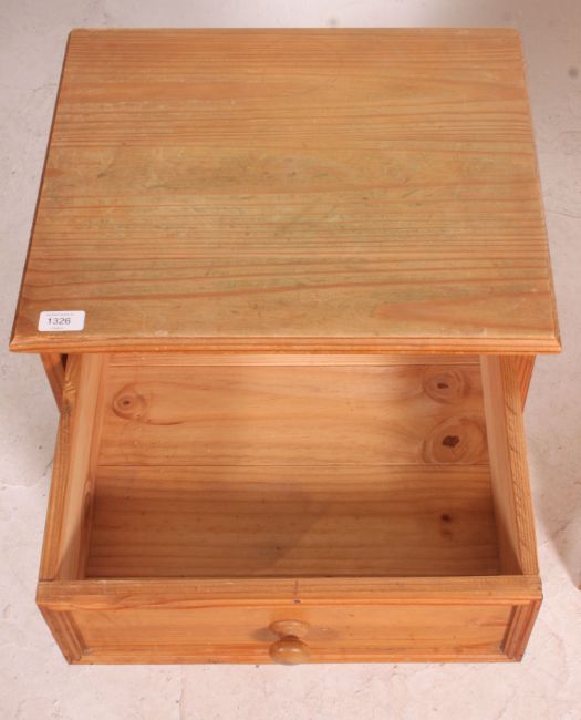A good pair of Victorian style pine bedside chest of drawers / cabinets, raised on plinth bases with 3 drawers and flared top above. Measures: 60cm x 46cm x 40cm.