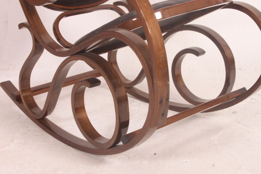 A retro bentwood Danish style patchwork leather rocking chair in the manner of Thonet having leather pad and backrest all on sleigh runners. Measure: 97cm x 53cm.