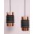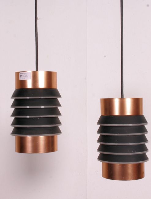 A pair of 1970's retro copper cylindrical drop pendant light shades having squeeze box style centres. Measures: 22cm x 12cm diameter.