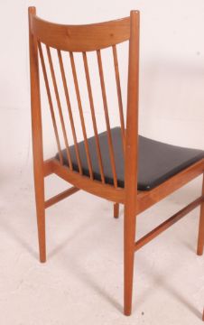 A stunning set of four retro vintage teak wood high spindle backed dining chairs with faux leather seat covers by SIBAST Of Denmark and possibly designed by Arne Vodder . ( Applied labels to underside of chairs incl. Danish Control Furniture Makers) Measures: 98cm x 49cm x 50cm.