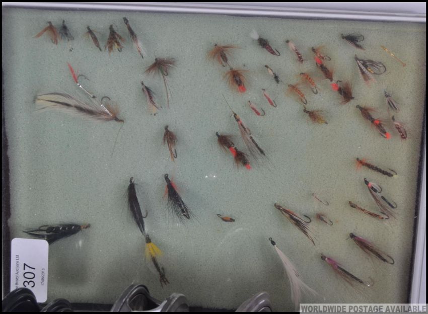 A collection of fly fishing reels to include examples by JW Young & Son, Roddy 31, Morrity's, Little Kraka, Allcocks and also a case of flies