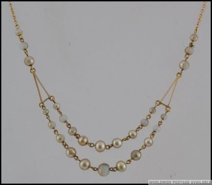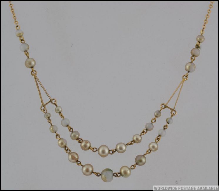 A 1930s part 9ct gold and faux pearl festoon necklace with spring hoop clasp. Measures 16 inches. Marked 9c tests 9ct gold excluding clasp.