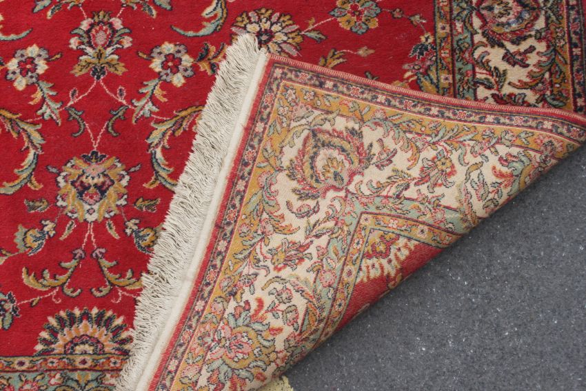 A large French Persian rug having red ground with geometric borders having label to verso for Baghdad. Measures 170 x 240