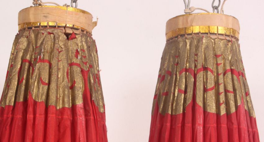 A set of 4 vintage Chinese lanterns of cylindrical form with red paper and wooden ends. Measures: 106cm x 23cm