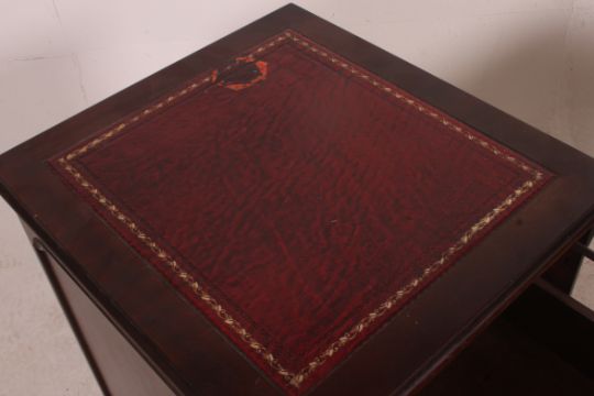 A pair of antique style mahogany and leather pedestal filing cabinets. Each with a plinth base with a series of twin deep drawers. Above a gilt tooled leather writing skiver. Measures: 77cm x 54cm x 59cm.