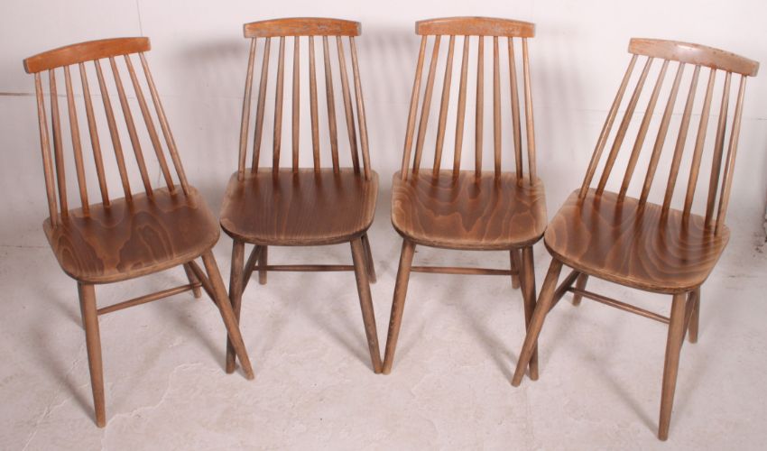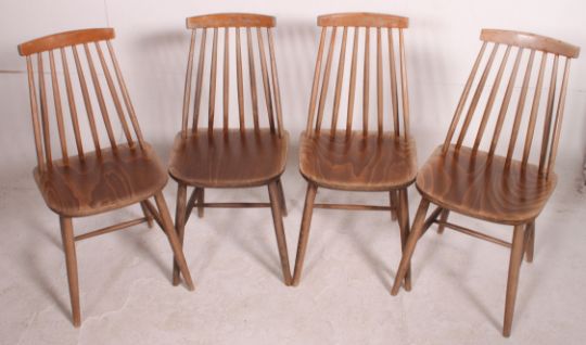 A set of 4 retro Ercol style stick back dining chairs with saddle seats raised on turned legs united by stretchers. Measures: 60cm HB