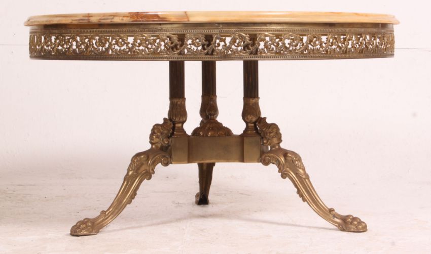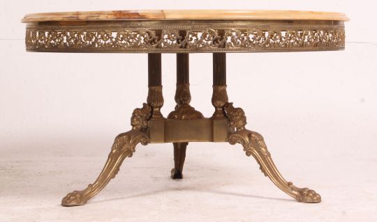 A 1950's rococo brass and gilt metal occasional coffee / centre table. The base with splayed legs having fret pierced rococo frieze and marble top inset centre. Measures: 47cm x 85cm.