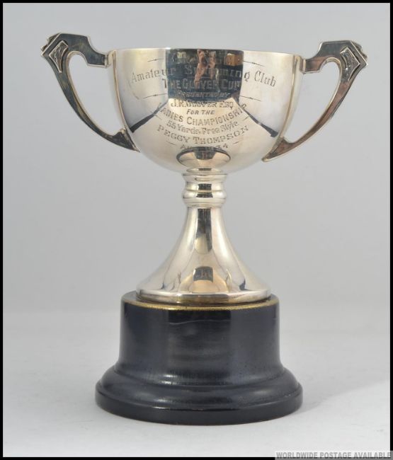 A silver hallmarked trophy on ebonised plinth. The trophy awarded for ' Grange Amateur Swimming Club, The Glover Cup, August 1934'. Total weight 211g. Measures: 16cm H