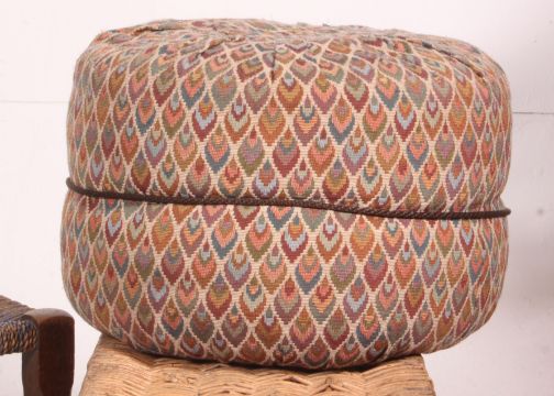 A vintage folding Savaronola chair together with a retro pouffe and 2 weave stools and a rattan whicker table. Measures: 50cm x 50cm x 24cm.