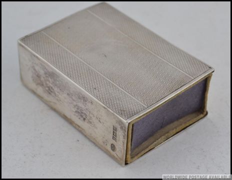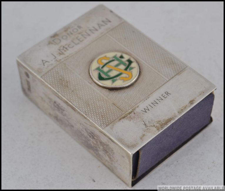 A silver hallmarked machine turned match box holder, having an applied enamel badge to the centre, with notation stating Donor A. J. McLennan, Winner, please see images. Measures: 6cm L.