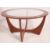 A vintage teak 1970's atomic style oak quarter veneer round coffee table with glass insert top and lower shelf. Measures: 45cm x 84cm diameter.