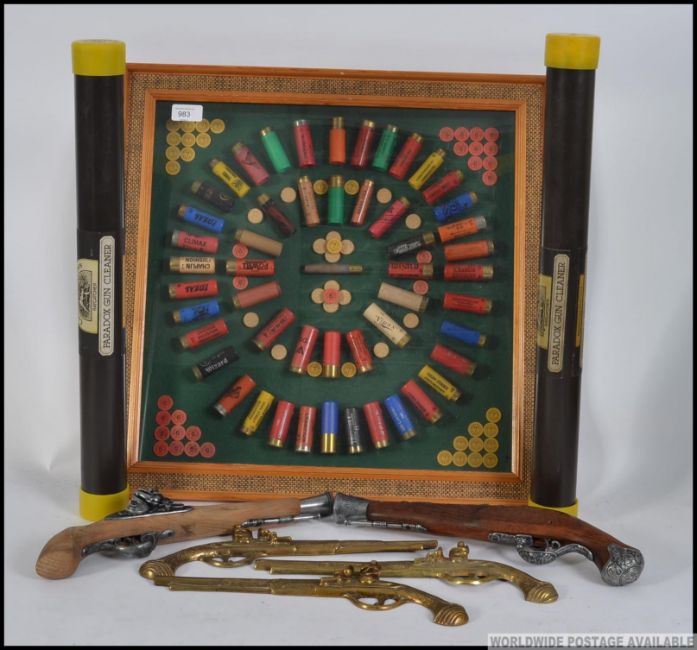 A framed and glazed hanging collection of shotgun cartridges being baize lined within together with brass wall hanging muskets. Measures: 57cm x 57cm.