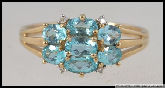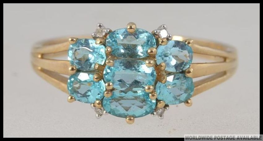 A hallmarked 9ct gold dress ring with oval cut blue topaz in a lattice setting with diamond accent stones. Hallmarked Birmingham. Size S. Weight 2.8g.