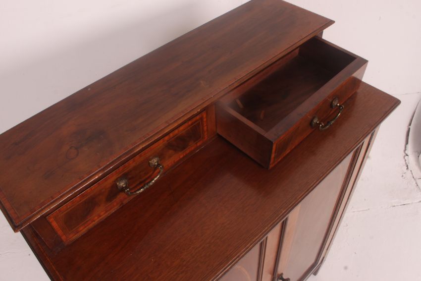 A fine Edwardian mahogany drinks cabinet. Raised on square tapered legs with twin oval inlaid doors having a two drawer gallery top above. The inner with fixed shelves ( 3 in total ) Measures: 104cm x 76cm x 40cm.