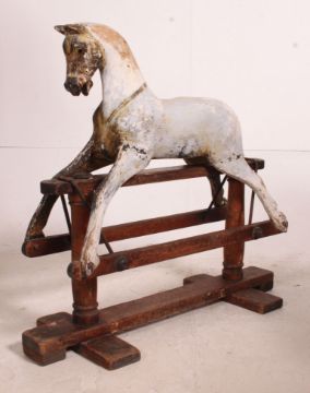 A good early 19th century wooden rocking horse with plaster finish retaining some original paintwork and raised over wooden glider base with cast iron straps. Measures: 87cm x 92cm x 36cm.